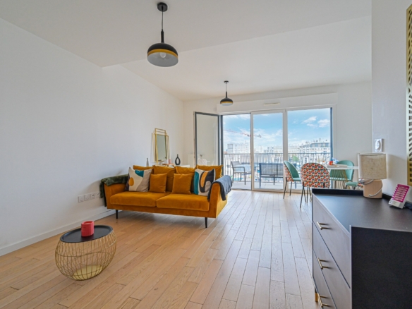 Un grand séjour lumineux de plus de 25 m² avec cuisine ouverte, donnant accès à un balcon de 8 m² (profondeur 1,40 m), exposé Est et sans aucun vis-à-vis,