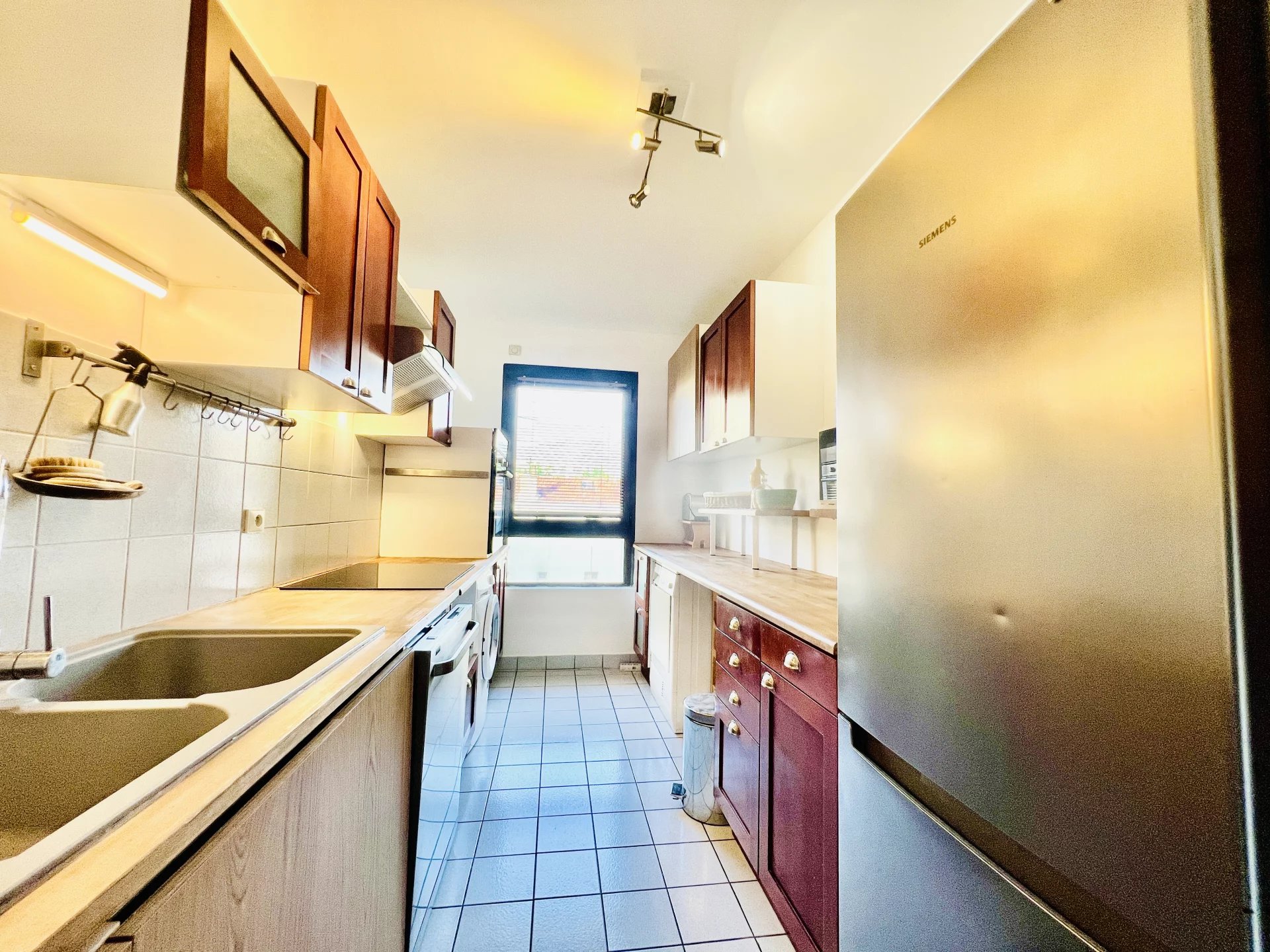 L’appartement qui dispose d’une entrée, un grand séjour aménagé, donnant sur la terrasse qui donne sur cour arborée, une cuisiné séparée, aménagée et équipée(four, rangement, micro-onde, machine à laver, sèche linge, lave-vaisselle, plaque chauffante, vaisselles, couverts), une première chambre aménagée avec de nombreux rangements, une deuxième chambre avec rangement donnant sur la terrasse, une salle d’eau, un WC séparé et une cave en sous-sol.