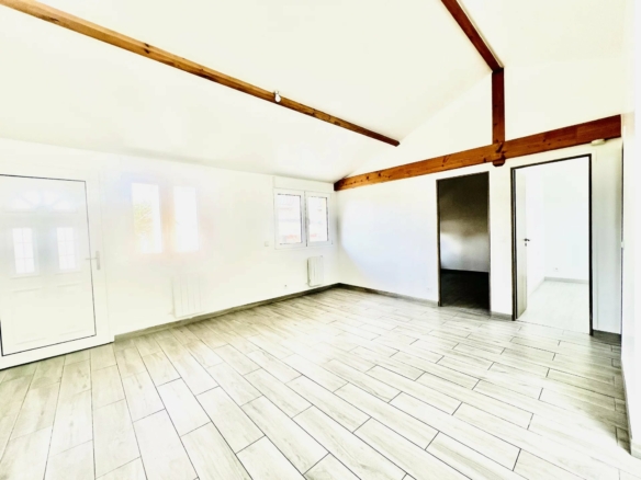 Très lumineux avec hauts plafonds et poutres apparentes.